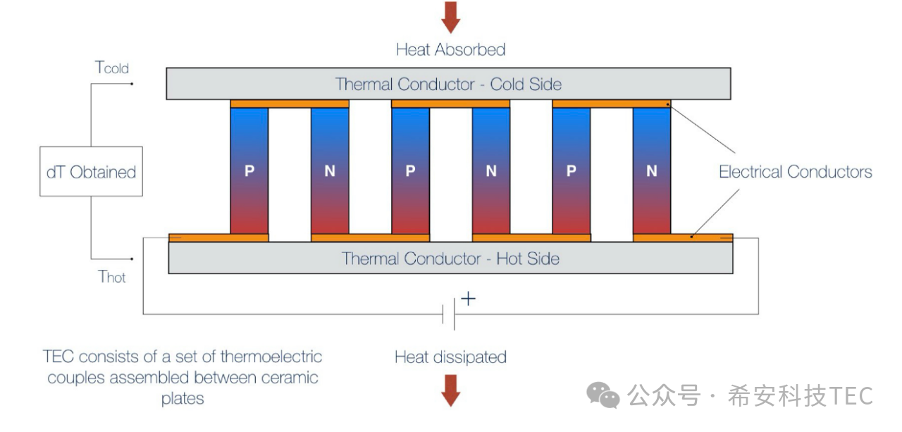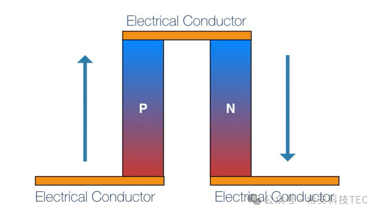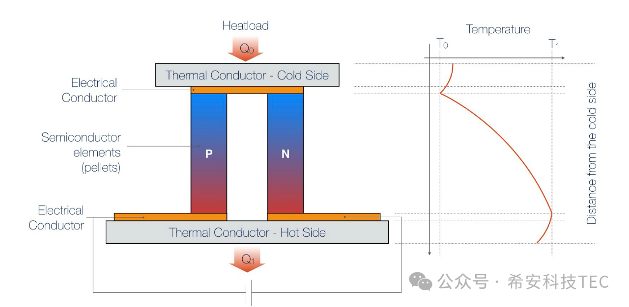 थर्मोकपल के दोनों सिरों पर थर्मल कंडक्टर जोड़े जाते हैं जैसा कि निम्नलिखित चित्र में दिखाया गया है: एक पूर्ण टीईसी बनता है। जब टीईसी संचालित होता है, तो ऊपरी सतह गर्मी को अवशोषित करेगी, जिसे ठंडा अंत कहा जाता है, और अवशोषित गर्मी Q0 है। निचली सतह गर्मी छोड़ती है और इसे गर्म सतह कहा जाता है, जिससे निकलने वाली गर्मी Q1 होती है ; Q1= Q0+Qtec